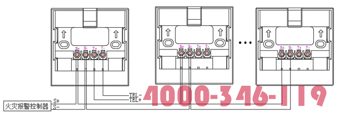 “S+”、“S-”為總線(xiàn)端子,接入火災(zāi)報(bào)警控制器;“T+”、“T-”為對(duì)講電話(huà)接線(xiàn)端子,可根據(jù)需要接入消防電話(huà)主機(jī)。